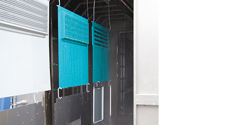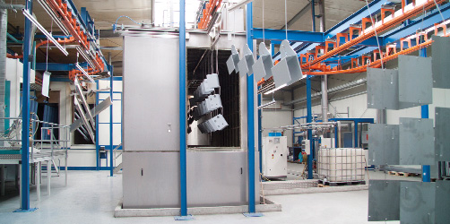 Die Stärken unserer Sonderanlagen zeigen sich in der optimalen Abstimmung der WIELAND Anlagenkomponenten, die zu einer Komplettlösung verknüpft werden können wie bei einer Komplettanlage.Die Beschickung erfolgt manuell durch eine Hub-Senk-Station. Die zu behandelnden Teile werden hochautomatisiert mit der Power+Free-Technik durch die einzelnen Stationen der Anlage geführt wie Durchlaufreinigungsanlage, Haftwassertrockner, Pulverbeschichtungskabine und Pulvertrockner.